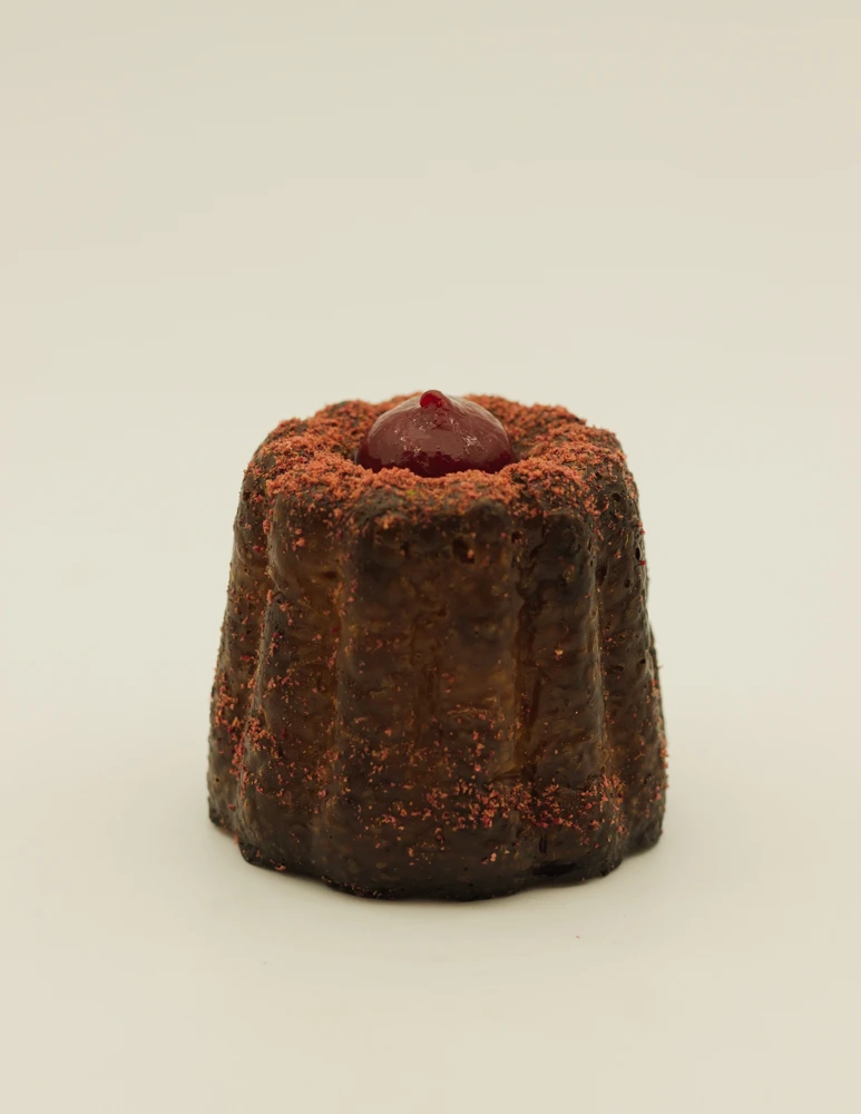 Наш классический канеле с клюквенным джемом и малиновым кули. Сверху покрыт пудрой из чёрной смородины